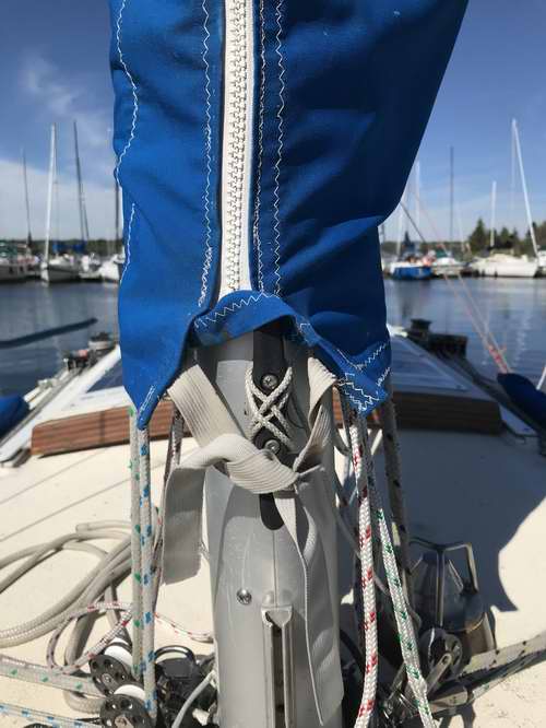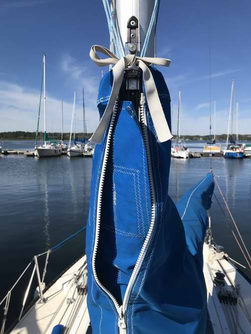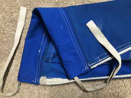 UPDATE NEW ZIPPER (2025) - After 40 some years the zipper at the front finally broke. They just don't make stuff like they used to! I was forced to cut through the zipper fabric to release the sail cover after several bottom teeth broke off. That's frustrating to have to do on the ramp during haul out. Besides replacing the #10 YKK marine grade plastic zipper, I also replaced the short bottom straps for longer ones. The softer material should hold a knot well, creating better support to the bottom of the zipper. The top straps will remain as they are. |