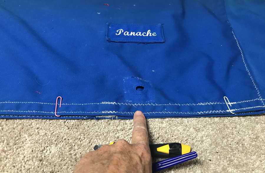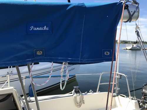 WATER PROOFING (2020)- This mainsail cover has been on Panache's boom since ~1980. I've added a few bits and pieces over the years to improve it, and repaired loose stitches, but not much else. It has also received occasional water proofing with silicon spray but I have never seen the need to wash it, thinking that the rain could do that job. However, after all the years of service I thought it high time to apply a thorough water proof treatment. First I washed it in a laundry tub where to my surprise a lot of coal dust came out. This is from the adjacent open pit coal mine that is now closed. Then I applied NIKWAX TX.DIRECT Spray-on till it saturated the fabric. The advantage of Nikwax over silicon spray is that it can water proof the fabric and retain breathability. I like the fact that the bottle has a pump, negating the propellant that can affect the chemical cocktail creating the water proofing. Nikwax can actually water proof down feathers in a sleeping bag so you stay toasty warm in damp weather. AFT STRAPS (2023) - I finally replaced the short strap on the aft end of the cover with a longer reinforcing strap that also straddles the seam where I extended the cover to full length. The end of this reinforcing strap includes a SS ring to minimize wear from the pull of the tie down strap. TWIST LOCKS (2024) - A SS twist-lock used to be installed right where the mainsheet block rests, making for difficult fastening and an unsightly appearance in the slip. I was reluctant to move it considering the hole that would need to be mended. Now that I have a heavy duty sewing machine I finally moved the twist-lock aft then added another one forward of the mainsheet block and mended the hole. This will allow the cover to rest straight and wrinkle free on the boom. The hem for the top strap around the mast was showing some wear and was replaced. There were also some small tears from snags that needed mending. After a good washing and water proofing, the cover is good to go. Panache's mainsail cover has survived so many storms that I've lost track. This is the single redeeming quality that keeps me from converting it to a stack pack; besides the fact that I don't feel like changing a perfectly good working system! But it is showing signs of degradation so I took the time to do some sewing. Look after yours.