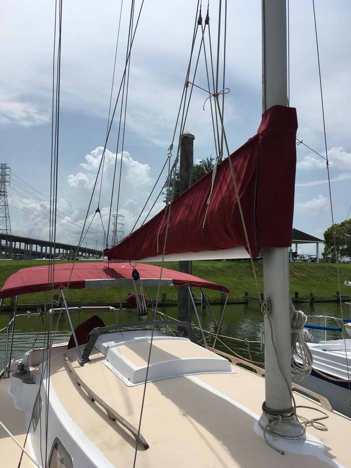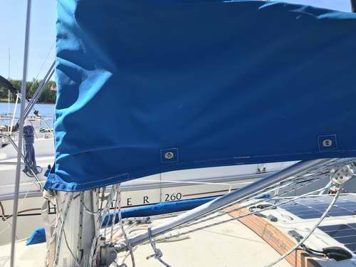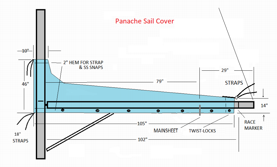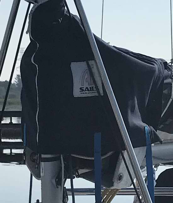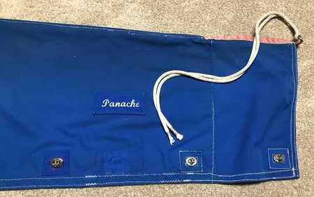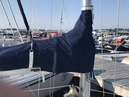 CONVENTIONAL COVER - A mainsail cover of Sunbrella prevents UV damage to the sail when it isn't used. It also protects the mainsail from storm damage or bird poop! Many sailors customize the cover with the name of their boat. I much prefer to cover the mainsail than remove the sail from the boom after each float. As the expression goes: "It's definitely the lesser of two evils."