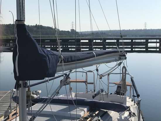 DON THE COVER - I place Panache's rolled up cover over the boom, similar to throwing a saddle on a horse. The top straps are tied around the mast just above the raised spinnaker ring. The internal flap is folded against the front of the mast to protect the anodized finish from the YKK zipper that zips up the front. The bottom straps are tied around the front of the mast to off load the zipper during strong wind. And finally the cover is unrolled towards the end of the boom where the end straps are tied around the boom topping lift to smooth the wrinkles. Finally the SS twist-locks along the bottom are done up. I also set the main sheet to starboard, secured with a line tied to the bottom of the starboard stanchion, pulling against the main sheet to keep the boom from swinging. The boom topping lift keeps the boom just above my head. I board Panache from port just like a horse. DOFF THE COVER - The sail cover is usually rolled up from the forward end to