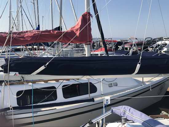 STACK PACK - A stack pack is an improvement on the conventional mainsail cover since all you have to do is pull the zipper along the top to expose the mainsail for hoisting. This speeds deployment and more important, speeds dousing for inclement weather. Its all in keeping with the edict that, "If its quick and easy to do you are more likely to cover the sail quickly to protect it". The covers stay on the side of the boom while sailing so you don't have to pack it away, eliminating another loose item on a berth. Some sailors object to the loose cloth hanging along the boom and have figured out how to pucker the cloth up against the boom, leaving things neatly stored and the mainsail fully exposed for reefing. This clever bit takes some ingenuity. The better designed stack pack can be pulled tight against the boom so it doesn't flop around when sailing. Closing the front was problematic with the early versions as the open sides would catch wind. Experimenting with different techniques solved this problem with designs that wrap around the mast as shown in the example at right. Other designs tuck it against the aft face of the mast. In many cases the portion that goes around the mast is tucked in one side along the boom. On some designs it is removed and stored in the cabin. The lazy jacks typically hold up each side of the stack pack with the assistance of a PVC rod through the hem along the top. This makes catching the mainsail slick and pulling the zipper along the top easy. The downward slope to the end of the boom sheds rain, albeit into the cockpit. But that's what cockpit drains are for. This one looks like a Sailrite design. |
