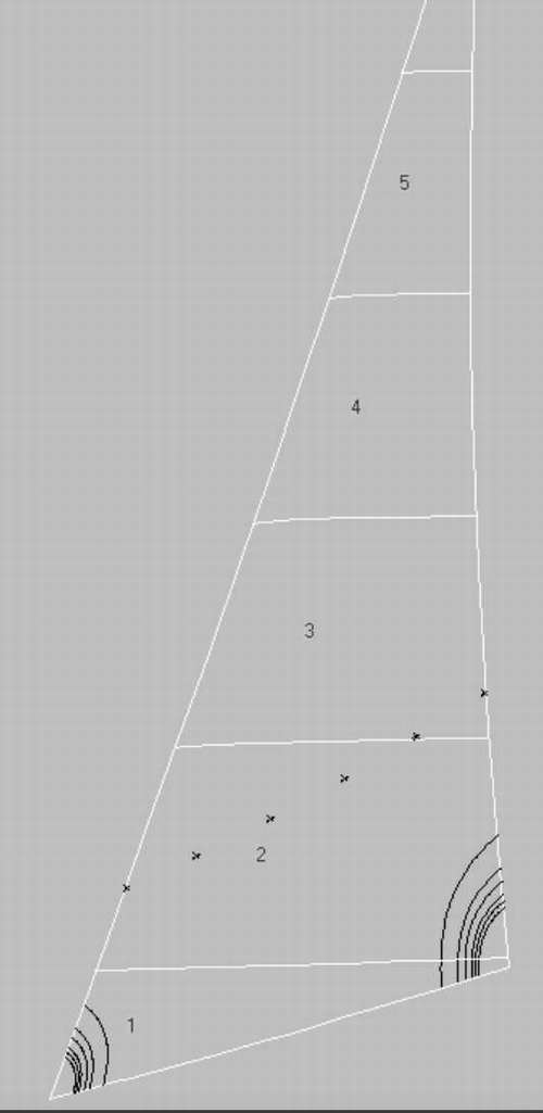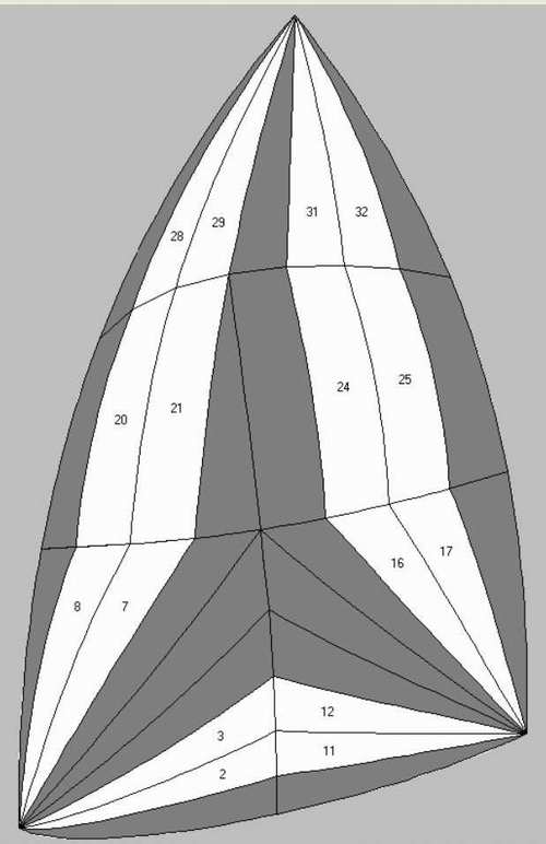 MAINSAIL - This is a rather complex sail to sew. The draft has to be exact to pull properly. I only have repair experience with a few mainsails, so can't comment on sewing one. (insert pattern here) | |