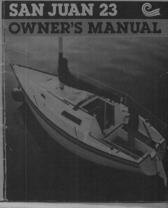An outboard tank may be used in the port cockpit locker, however, this locker must be vented in accordance with regulations per Motorboat Act of 1940. ------- INDEX ------- A 40 amp hour 12 volt battery in a plastic case is recommended. Obtain wing nut post connectors if possible and strap the battery securely to the inboard face of the aft settee compartment on the starboard side. ------- INDEX ------- The mast and boom of your San Juan 23 are anodized to give the aluminum protection from salt spray and natural elements. It is good to tie all halyards and shrouds away from the mast while trailering and mooring to prevent chafing the anodized finish. Washing with a water hose after sailing in salt water is a good practice. A clean mast and rigging help keep sails clean so wipe road dirt, etc, off before stepping the mast. ------- INDEX ------- Standing rigging should be inspected periodically for broken strands or loose bolts and clevis. Also check turnbuckle barrel lock nuts for tightness. Keep the spreader tips well taped to prevent damage to the sails. Running rigging may become stiff with dirt and salt after use. This can be remedied by washing in light detergent or flushing with a garden hose. Always tie a figure eight knot in the ends of the main and Genoa sheets to prevent them from coming out of the blocks or fairleads. Never tie a knot in the end of the spinnaker sheets. ------- INDEX ------- The keel centerboard is designed to give maintenance free operation, however, the boat should [be] hoisted yearly and the trunk cleaned of marine growth, and the lifting wire inspected. Replace the wire if any broken strands are found. The pin for the centerboard is movable fore and aft. It is installed in the middle position, however, [it] may be moved [forward] if more weather helm is desired and aft if a more leeward helm is desired. The centerboard pin is on a "stirrup" which is lag bolted to the bottom of the keel. Ensure that the lag bolts are put in with polysulfide (Boat Life) caulking compound.