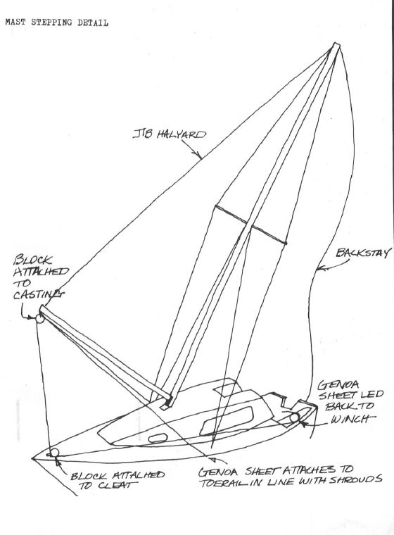 Note: Step 7 can be avoided by physically fit adults if one person walks the mast up like a ladder while another person assists by standing on the foredeck and pulling on the forestay. ------- INDEX -------