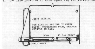 ------- INDEX ------- Many sailors prefer to leave their teakwood "bleach" and thus do nothing for maintenance. To preserve the oiled finish, however, it is necessary to re-oil the teak with a good teak oil such at Watco or Tung oil whenever it becomes noticeably weathered. ------- INDEX ------- The cushions are fabric Scotchguard and may be cleaned with a damp cloth. Care must be taken to prevent mildew by turning cushions upright when leaving the boat. When boat is out of use for a longer period of time, remove the cushions and store in a dry place. ------- INDEX ------- Always remove the battens, fold carefully, bag and store sails in a dry location. Never fold wet sails, but wait until dry to prevent possible mildew. Dacron sails can be rinsed free of salt with fresh water, then laid on the grass and rinsed with water hose. Never iron sails to remove the wrinkles. ------- INDEX -------