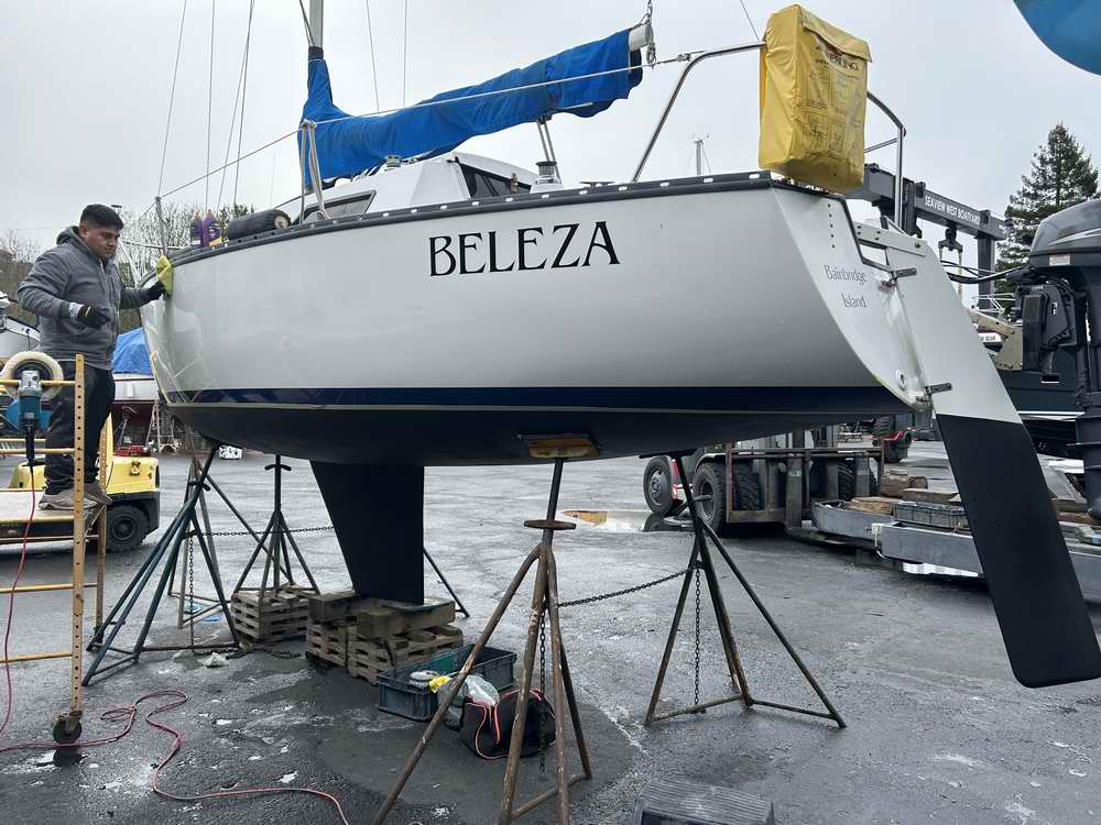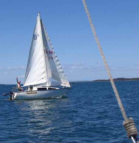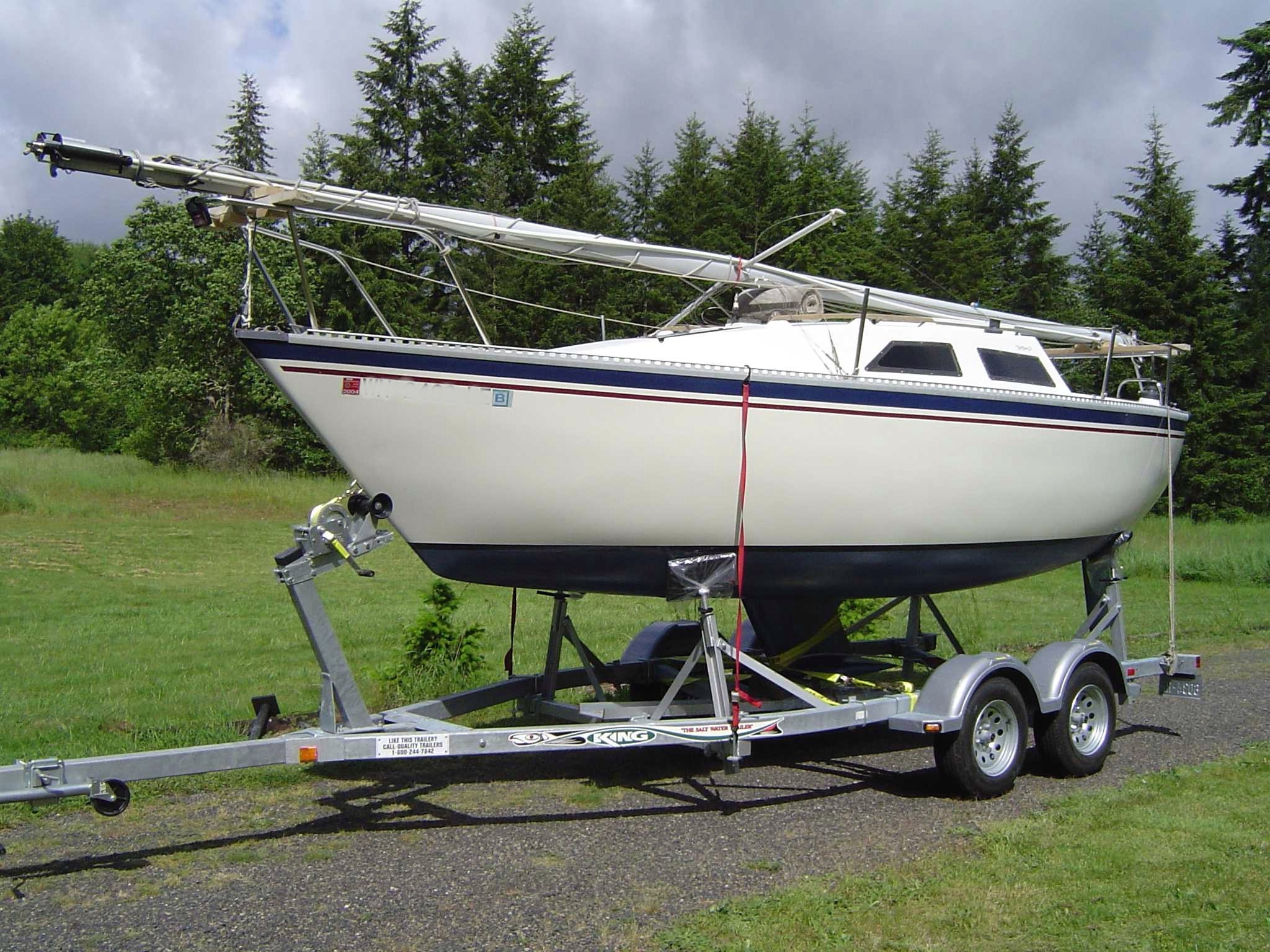 As far as I can tell she was the last SJ23 that was made (1988 fixed keel, H2). She has a 28' tall mast with 1100 lb lead winged keel, inboard rudder (same as on the SJ24) and custom interior. She started life as a Mark I as there are fluctuations on the hull where the shoal keel used to be. They are now filled in and replaced by the new wing keel. I am the third owner and she is moored in the Pacific North West. I have enjoyed sailing her in Puget Sound for just over a month now. At this point in time (2006) I sail her solo. I have added a jib down haul line to make dousing sails easier with fewer trips to the bow. I plan to haul her out this winter for an overhaul to make her easier to single hand. Items on the list are a CDI FF2 roller furling system and I'm thinking of painting her bottom with a Teflon paint. Along with the major projects, the normal stuff will also be taken care of like replacing the window/hatch seals, and buff & polish the gel coat. From the limited view of the keel support, viewed by lifting the (2x.5)' long bilge board on the cabin sole, it seems rather beefy. I have spoken with the builder and the original owner who both indicate the build came in over the designed 3200 lbs. The transom was overbuilt by several hundred pounds. The owner indicated that the depth sounder hull fitting goes through nearly 2" of glass and resin, ~3' forward of the keel." Erik Nystuen