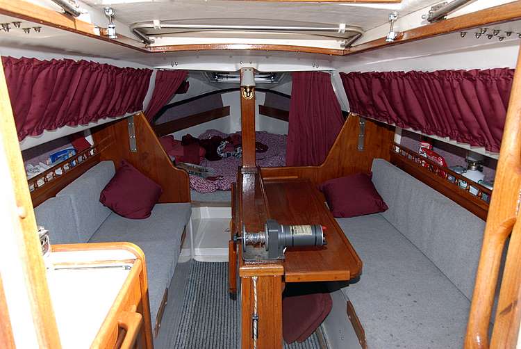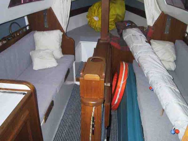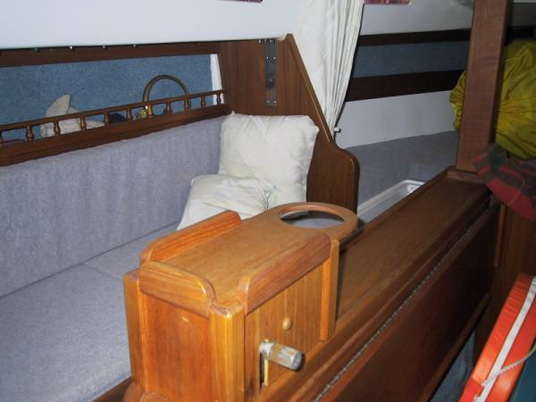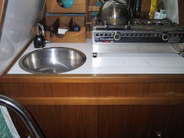The forward cabin layout of the Windward 7 is the mirror image of the SJ23 MKI; i.e. head is to starboard and V-berth access is to port. The galley is to port of the companionway with a “coffin” quarter berth to starboard. Like Panache she has a clear companion way ladder (no galley bench to step over). The starboard saloon berth has a length of plywood that lives behind the backrest when not in use. It fits between the folded table and settee making a very comfortable “single king” or ”mini double” berth. This is OK for two small adults or great for two kids. I really like the ideal place to store the boom, resting on the starboard settee and bulkhead.