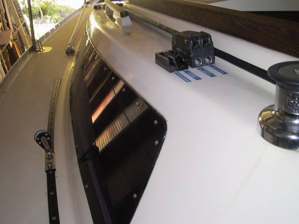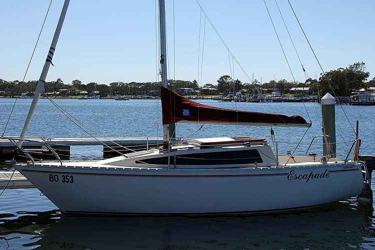 The Melbourne based manufacturer, RMK Marine, acquired the molds in the late ‘80’s or early 90’s and built a total of 8 boats. I believe most of which were fitted out with a “luxury” interior including heaps of teak trim, Barlow 15 winches for halyards and Barlow 16 for primary winches for and a Mariner 9.9HP 2 stroke. The previous owner upgraded ours to a 10HP Honda 4 stroke which although heavier is much quieter and heaps more fuel efficient. On our last cruise we used less than half the fuel than my old Mercury 9.9HP 2 stroke pushing our much heavier old 20’ boat. RMK Marine is still in business but now builds large “Oceanic” brand cruising catamarans. They were nice enough to give me this background info. Note the different features from the North American version: pop top, entry to forward berth on port, motorized lift board and hand holds for companionway access.