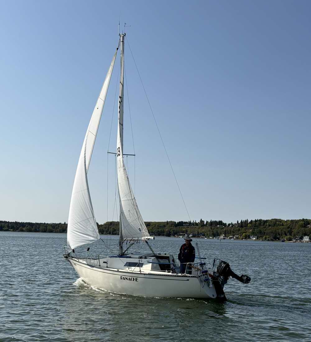 This was an unusual day as I was the only boat on the lake till a lone sloop appeared through the haze, sailing towards me from the East end of the lake. It was laid over at 30 degrees for most of the time. I had no desire to work that hard so chose to close reach across the West end of the lake. The day started with a double reefed main and slightly rolled up jib, sailing at 5+ knots. Winds were at 20 knots, gusting to 40. It was fun sailing through the williwaws coming over the hill since a couple of times Panache peaked at 8 knots, which really surprised me. After a few hours of this my buddy from the sail club joined me which is when these photos we taken. Enjoy.