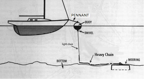 Mooring Design for a Pocket Cruiser. INDEX - Weight, Chain, Fittings, Ball, Pennant, Deck Fittings, Set a Mooring, Move a Mooring, Winter Storage, Hunting at the Mooring, Mooring corrosion. |