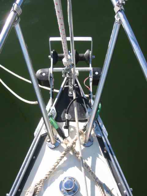 preferably at or below the water line. Both ends of a 3/8" poly lift line are directed over Panache's bow roller and secured to a strong cleat on the bow. A Venture 23