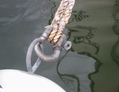The float MUST be equipped with a swivel, either internal or external, to prevent torque loading (twisting) of the chain and premature wear. Twisted chain wears much faster than strain relieved chain. Most rigid foam filled or inflated mooring balls are equipped with an internal swivel, so attach your light chain directly to the bottom ring using a shackle. Wire all screw pins shut using mild steel wire in such a way that the chain cannot rub against it. See the picture below. OWNERSHIP - Label your mooring ball with the name of your vessel, owner name, address and phone number to designate ownership. This is a mandatory regulation under the Canadian Coast Guard Aids to Navigation and it sure minimizes confusion when a guest arrives in the anchorage. I've been told this rule is seldom enforced by the Canadian Coast Guard but it may be legally advantageous to comply should another vessel founder after striking your mooring ball. Ask a lawyer!