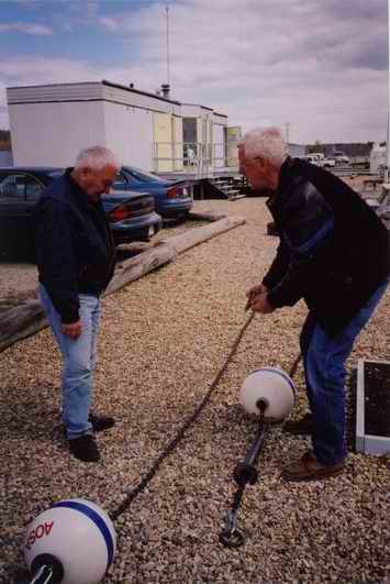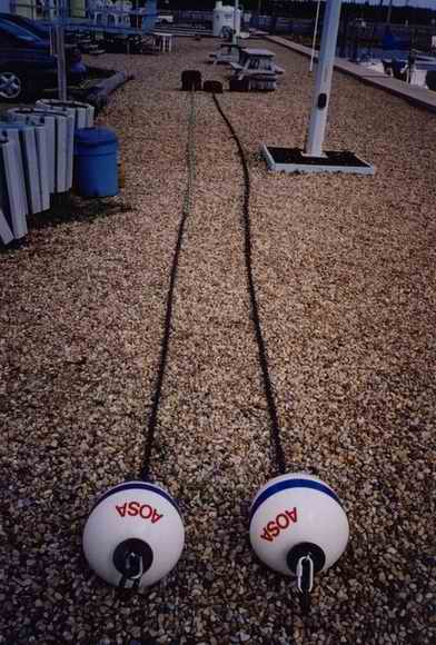SET A MOORING DRUM FROM A SAILBOAT - Attach the chain to the drum and roll it into waist deep water so you can float the bow over it. Slip a 30' length of 1/2" yacht braid through a chain link, run it up to the bow and tighten the line. This should pull the bow down so when you walk to the stern it should lift the drum off the bottom. Slowly motor to your previously marked mooring spot and let out the line so the drum settles to the bottom in a controlled fashion. This ensures that the drum rests upright on the bottom. In 10' of water you require about 30' of line to have a workable tail end on deck. Keep the line taught to the surface while you retrieve it. A flat barge is another excellent platform for this type of work. In many ways I prefer it due to the extra stability and walking area. SET A MOORING DRUM FROM A DINGHY - Attach the chain to the drum and slide it into knee deep water over a plank laid on the bottom. Lash a 6' long (2x8)" on top of a dinghy so it sticks out 6" past the transom with the rest over the center seat. Lash it securely to the middle seat and sit on the plank. Float the dinghy transom above the drum. Slip a 30' length of 1/2" yacht braid through a chain link (just above the weight) and pull both free ends over the (2x8)". Snug up the line and secure both ends to a cleat on the plank. This will pull the stern down but as you sit in the dinghy your weight should counter balance the drum so it lifts off the bottom. Slowly row to your marked mooring spot and let out one of the lines (wearing gloves) so the drum settles to the bottom in a controlled fashion. This ensures that the drum rests upright on the bottom. Allow the chain to pay out freely, keeping some tension on it so the chain does not get trapped under the weight. In 10' of water you require about 30' of line to have a tail end of workable line in the dinghy. Keep the line taught to the surface while you retrieve it. Remember to attach a float to the end of the chain before you lower the weight to the bottom!