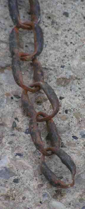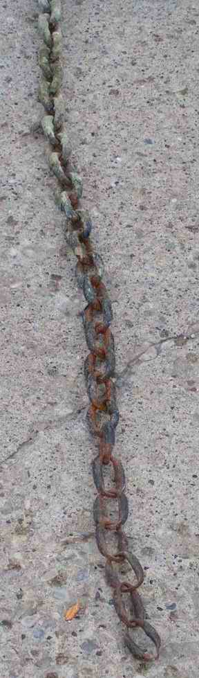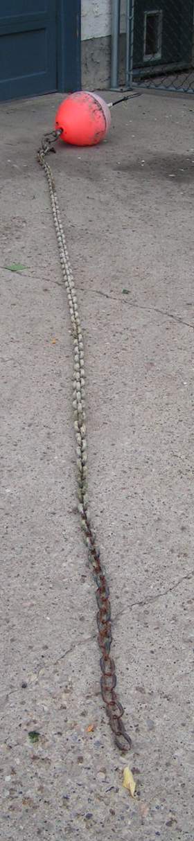 ____________________________________________________________ HOW LONG WILL A MOORING LAST? - The consensus by many sailors on Wabamun Lake is that a sail boat mooring will last a person's life time. This is probably true of the mooring weight but the same cannot be said of the mooring chain. In 2004 an old mooring chain broke at Poole Sail Club. For a while we didn't know what the cause was but when the broken mooring chain was compared to several broken dock chains at Sunshine Bay Yacht Club I noticed similarities. The surprising thing about all the chains was that the failure was in the same short section on all chains. This was the 1 meter of chain that rose up from the bottom muck. In all the chains the links above and below the failed section were in excellent condition. But just to add confusion, some PSC moorings have lasted longer than others, so this failure rate is not totally predictable. You have to keep an open mind. These similar failures started me wondering about the source of the problem. In the final outcome it is hoped that if a person can understand the factors then we should be able to guestimate the state of a chain and form an inspection and replacement schedule to prevent breakage. CORROSION - The metal corrosion that occurs in a prairie lake has to do with the chemical cocktail in the Littoral zone at the lake bottom. This is the zone that extends from shore out to the depths of where vegetation growth ends, which is the same zone in which we install our moorings. In most northern prairie lakes the Littoral zone has a bottom consistency of sand, mud, decaying vegetation ("loon shit") and in the case of Wabamun lake, coal dust. The water in this zone is also warm and contains the majority of the oxygen; two other components required for corrosion. This chemical cocktail produces a mild sulphuric acid that will corrode a steel mooring chain laying in the vegetation. Hence the rational of why the 1M of chain that leaves the bottom corrodes, leaving the rest in pristine condition. But the answer is not as simple as this. So why do some moorings last longer than others? This question can be answered by the factors that contribute to the rate of combustion or rot of vegetation; water temperature and oxygen content. Just slightly deeper than the Littoral zone is the thermo cline. If you SCUBA dive you can actually float on this denser cold water, it is that pronounced. It is significantly colder that you can feel if you dip your toes into it. The water below the thermo cline is usually very clean with good visibility. The important factor about this boundary layer of cold water is that it has less oxygen and a lower temperature that make for poor combustion. If a mooring is below the thermo cline, the steel remains virtually pristine and might actually outlast most boat owners. Steel in shallow warm water is usually immersed in mud and will stay relatively pristine due to the absence of oxygen. In addition, this steel cannot abrade because it does not rub against anything. In fact, I have pulled my mooring chain up out of the mud and it literally "rips" out of the bottom to reveal pristine metal. This almost make one consider not installing the drum, but I won't go that far! The pictures below are from a mooring that was below the thermo cline. The chain is 20 years old. Note the excellent condition of the links below the ball. However, at about 12' down the corrosion starts abruptly. This right at the bend to the lake bottom into the Littoral zone. Unfortunately the rest of the chain is still on the lake bottom so I cannot show it to you. I've pulled up pristine chain on other moorings. The corrosion does not occur where the chain is buried in the mud. A recent field of thought is to use a length of Dyneema line in the chain at the turn up from the bottom. The loops at the ends would have to be equipped with metal eyes.