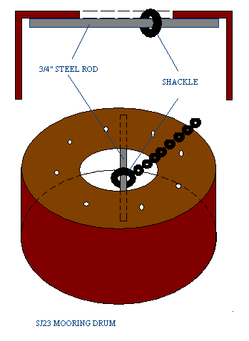 Be patient so you don't break things. MOORING INITIATION - The first time you connect your boat to your new mooring should be done in calm weather. It takes a week or more before the drum settles into the bottom, which is when the holding power really increases. How long it actually takes depends on how soft the bottom is. At Wabamun Lake, where the bottom is mostly sand and thin mud, this process takes a couple of weeks. If you have a gravel bottom it will likely take much longer. I couldn't begin to predict how tidal current affects the settling. That being the case I would suggest adding a second drum. Anyway, I think that slight tugging on the mooring chain during calm weather will hasten the settling process. The tidal current should help sink it as well. DO NOT connect the boat to a new mooring with a storm arriving. You will likely find her against a shore somewhere. WINTER STORAGE and SPRING RETRIEVAL - If the water in your area freezes during winter, you have to remove the ball and lower the chain to the bottom before it turns hard. Trust me, you don't want to attach a sacrificial float and let it freeze in the ice. You will likely find your mooring quite some distance from where you left it. Ice moves in winter! The clever thing to do is stay under the ice. Attach enough 1/2" nylon line to the end of your chain so it clears the surface by a few feet. It helps to splice a loop in the end for Spring pickup. Then attach 1/8" nylon line or light steel cable to the end of your 1/2" nylon line to extend it to shore. When close to shore bury the line or cable in the bottom so the ice can't get at it. Ever hear of ice moving a beach? I didn't think so. Tie the end of the line to a rock or something else you can find in the Spring. I usually do this in 1 foot of water. No sense in getting any wetter than you have to. The beauty of nylon or steel cable is that it sinks to the bottom where it can stay under a fisherman's hook. Occasionally the line sinks just into the bottom all the way to the mooring. You couldn't ask for better protection. One last point with regard to pulling the chain up to the surface in Spring, the 1/2" nylon line attached to the end of the chain is strong enough to really haul up on the heavy chain without fear of breaking. That might be the case if you used 1/8" line. Oops. Chain has a nasty habit of settling into the bottom over a winter and sometimes it can be quite a tug to rip it out of the mud. Once you get the end of the chain to the surface, flip the end over the gunwale, shove a screw driver though it and into the oar lock to keep it there, attach your mooring ball and flip the whole works back into the drink so you are good to go for another season. OK you were supposed to pull the screw driver out before flipping it all into the drink! Geeze. HUNTING OR SAILING AT THE MOORING (or ANCHOR) - Some hull designs continually "hunt" or sail at the mooring. This is really uncomfortable to the crew and hard on the deck fittings and mooring line. If your SJ23 hunts then consider the following hints: