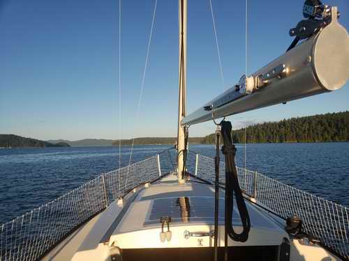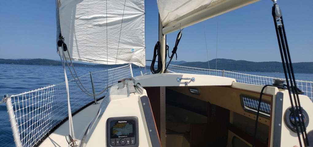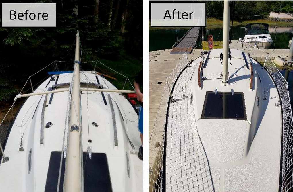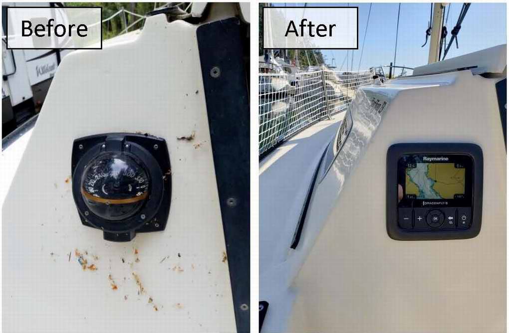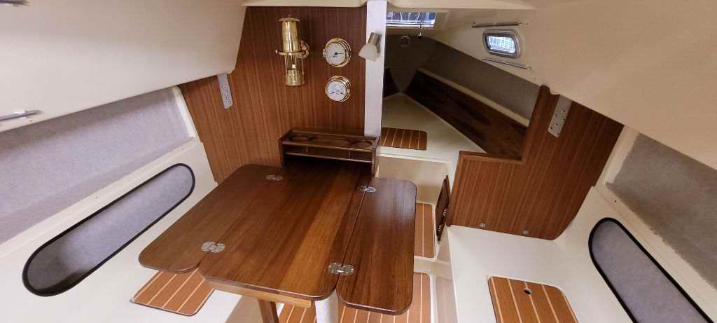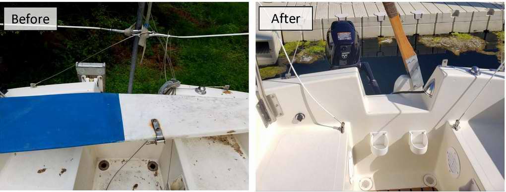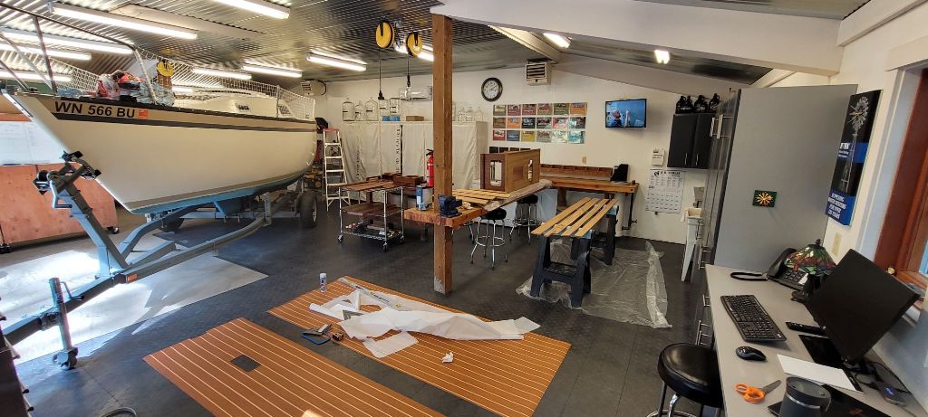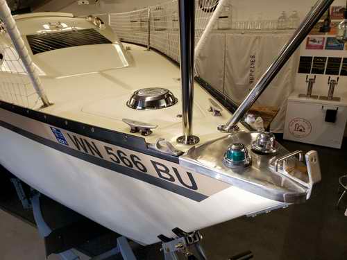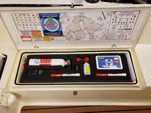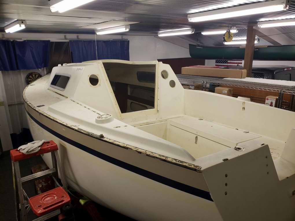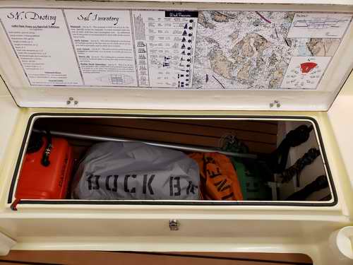 Destiny is a Clark Limited Edition hull with a distinct colours scheme plus a few extra features; painted spar and trim package. Destiny was in pretty bad shape when I bought her in 2017. It was my intentions all along to do a complete tear down and rebuild. For that reason she was in the shop all winter and spring. Everything was stripped off, about half was replaced and the other half was cleaned, polished and rebuilt. As of this writing the job is about half done and the interior is next. A new coat of non-skid was applied to the deck. Found this convenient place for a local chart.