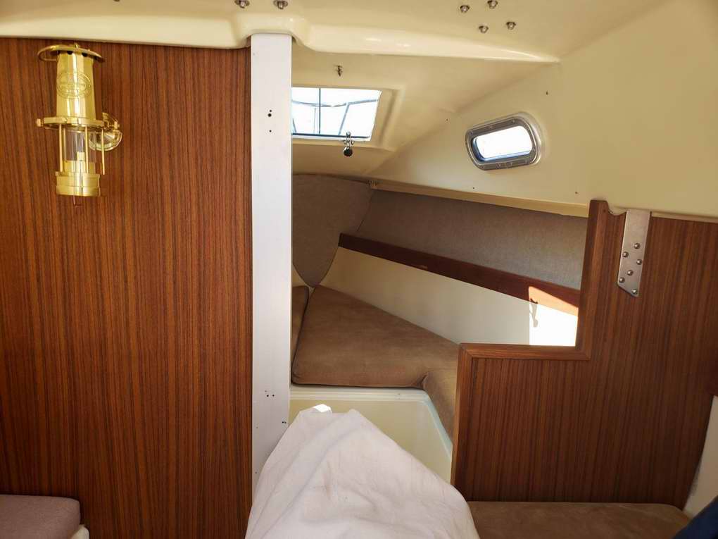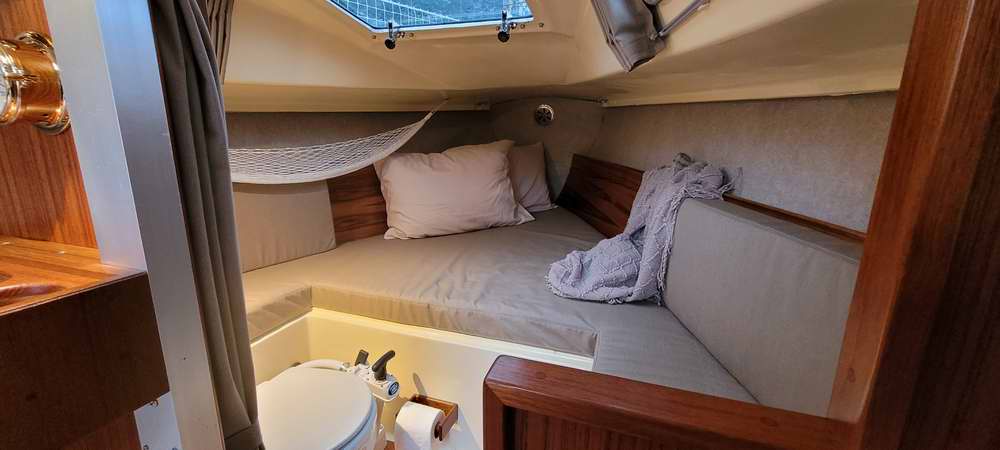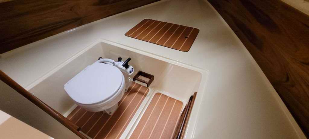 Lonseal marine flooring in the V berth. A marine head was never part of the original design. Nice touch.