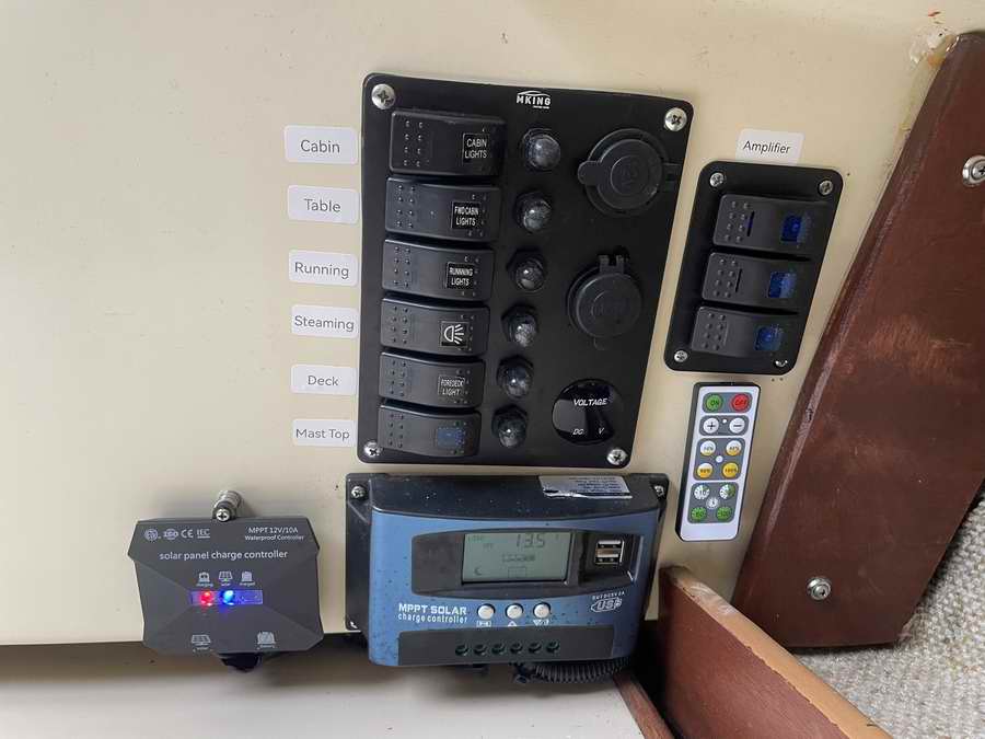 ![]() Power panel, MPPT charge controller, battery monitor, sound and system control all neatly installed on the aft bulkhead. Also included a complete rewire of the boat electrics. |