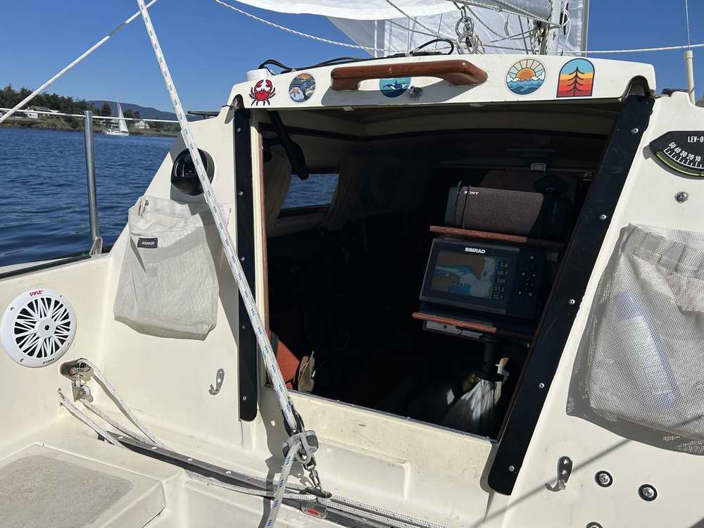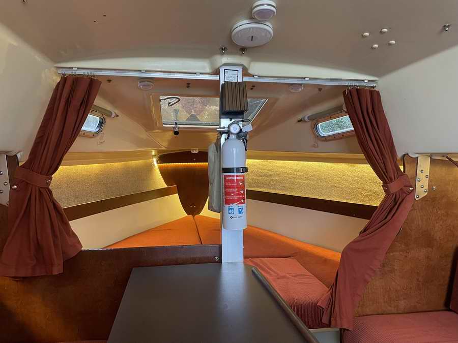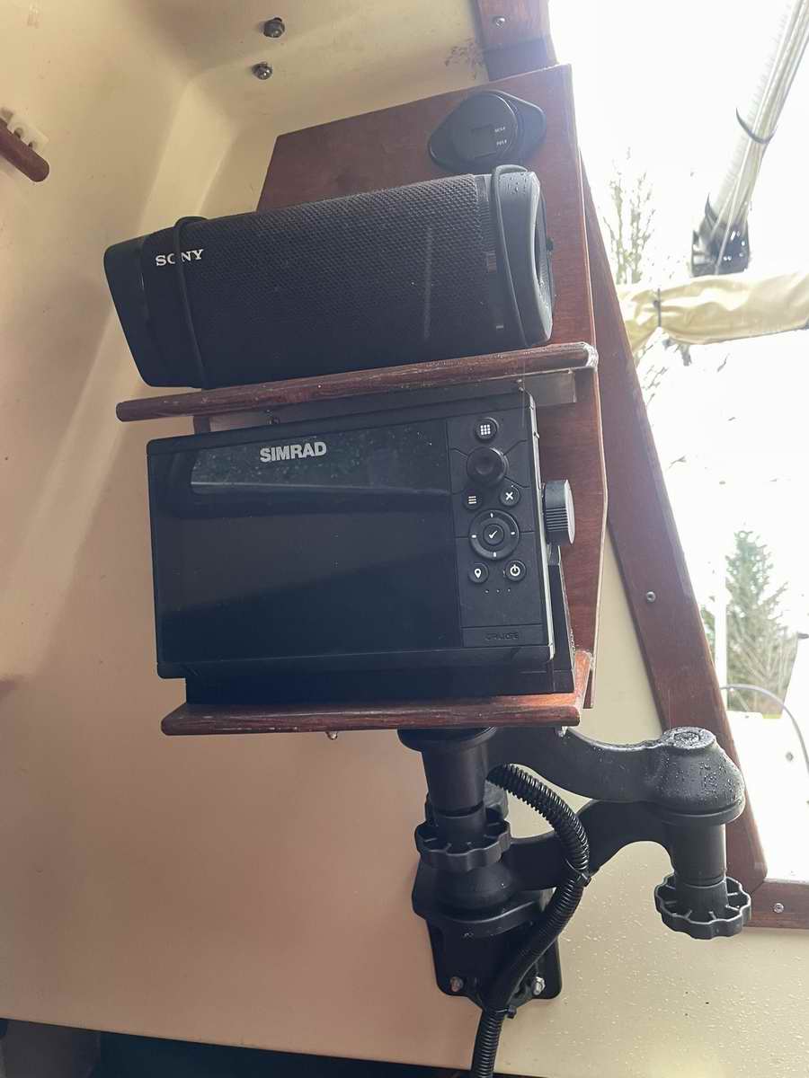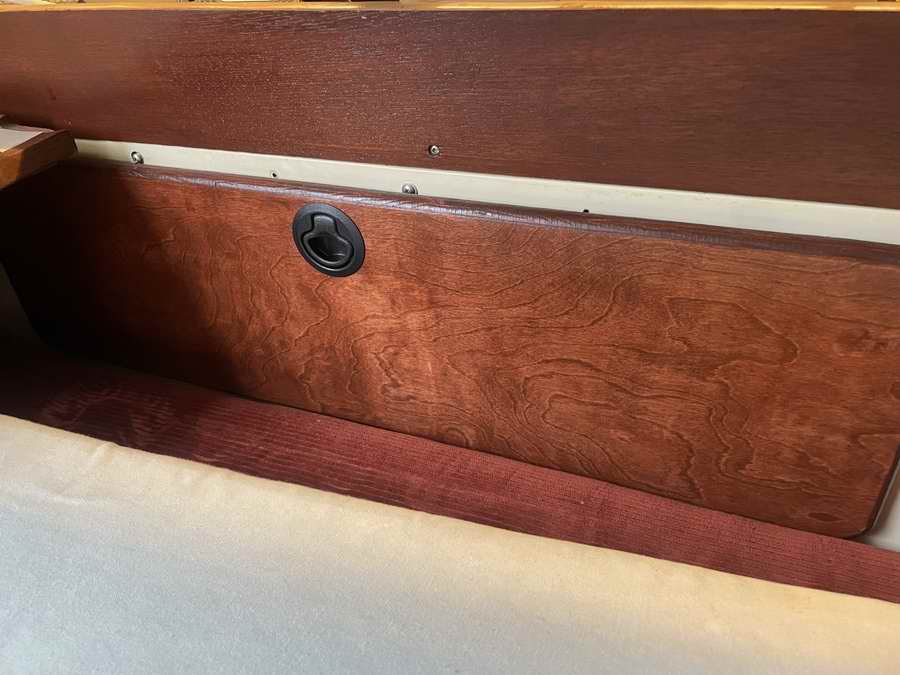 New lifelines with Sta-Lok fittings. Rocker Stoppers. Bottom paint with the boat on the trailer. New swing keel cable and strap eye. Complete rewire. Added mid ship cleats. Ram double swing arm Chart plotter / speaker mount (It’s a great piece of hardware). VHF antenna to top of mast. Aux VHF speaker. Rudder haul up line. Rudder paint. Tiller stain and varnish. Learned how to sew and made a spinnaker from a Sailrite kit. Forward berth storage access. Dyed curtains. Brass bushing on swing keel (I had that same gigantic hole that you mention in the tech tip. Now that it is the same size as the pin there is no slapping around. Resealed toe rail. Wiring for second solar panel. Auto pilot storage tube. Aux VHF speaker. Amplifier and speakers. Magma BBQ storage tray. Roll up curtains & companion roll up shade. Spinnaker halyard and mast head block outside of forestay. New topping lift. Companionway cooking tray. The following photos show the results of Robert's 2023/25 winter projects. You get a definite impression that he hasn't been sitting around because the boat didn't have any of these modifications when he started. |