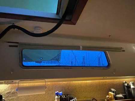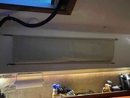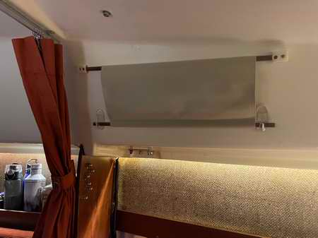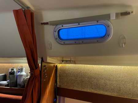 Nice indirect LED lighting. Note the roll up blinds over the small windows. Pull it down to slip under the two latches. The cushions get covered during construction time. |