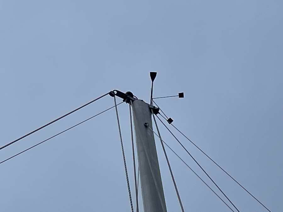 The 12" length of 1.5" x .25" SS flat bar is to mount a spinnaker halyard block. I drilled a .75" hole in the end, rounded the corners, and smoothed everything with an angle grinder. All standing rigging has been upgraded to StayLok mechanical fittings. |