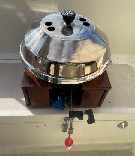 Fig 8, BBQ WITH STAND - A goofy looking stand for my kettle BBQ. There are times when I don't want to sail with the BBQ on a stanchion, but the shape of it makes it impossible to set anywhere without it tipping over or rolling around. This stand works.