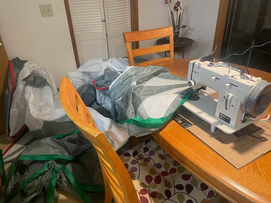 Fig 10, SPINNAKER - Robert taught himself to sew using the videos from Sailrite. From the looks of the stitches he is doing quite well making this spinnaker and sock. Regular, even stitches tell a lot about the quality of workmanship and the strength of the sail. It really helps to have a large room for a project like this.