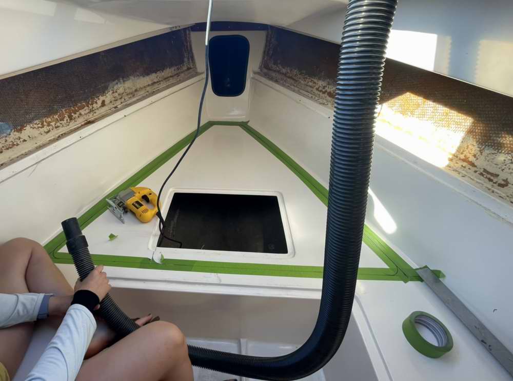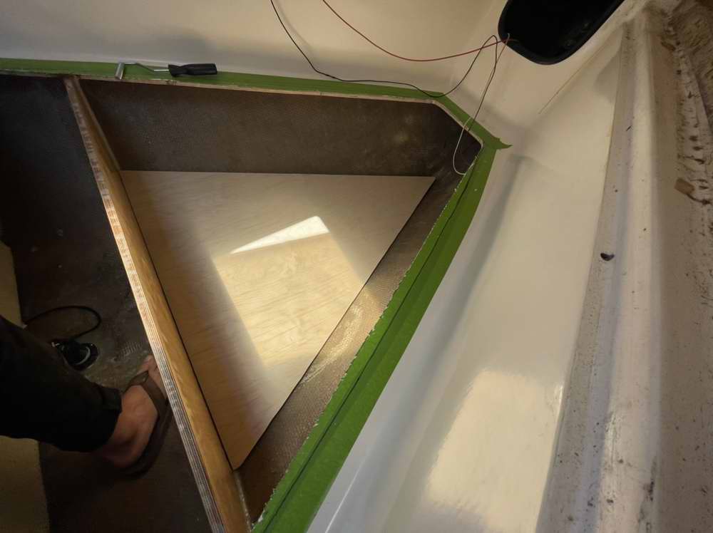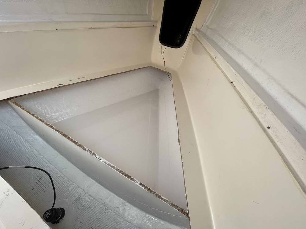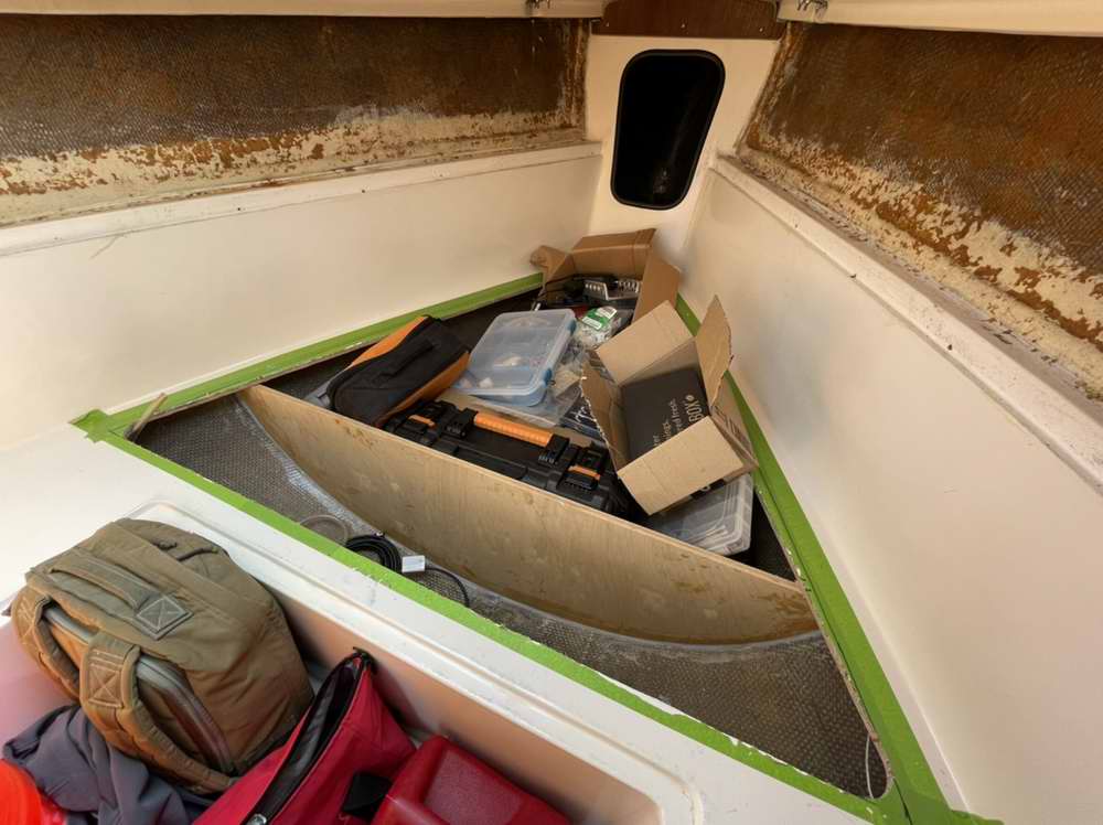 TRANSVERSE STIFFENERS to REINFORCE BOW. (July 2021) When we purchased Goodpain one of the first things I did was gut all of the wiring, bow to stern. When planning the new system, I decided I needed a better location for the battery and inverter/charger. I also noticed, as many have, that the SJ23 is a bit aft-heavy in trim with 2-3 sailors. Also, since most of the storage in the boat is temptingly in the stern, weight tends to accumulate abaft the beam. I also noticed that the V-berth was a woefully difficult space to access and would be perfect for an electrical and storage compartment. I like things to be compulsively organized, which in the case of electrical systems means well laid-out and that’s easier when things are flat. After reading some of the other pages on the website I figured I would take on a bow project with a few goals in mind:
