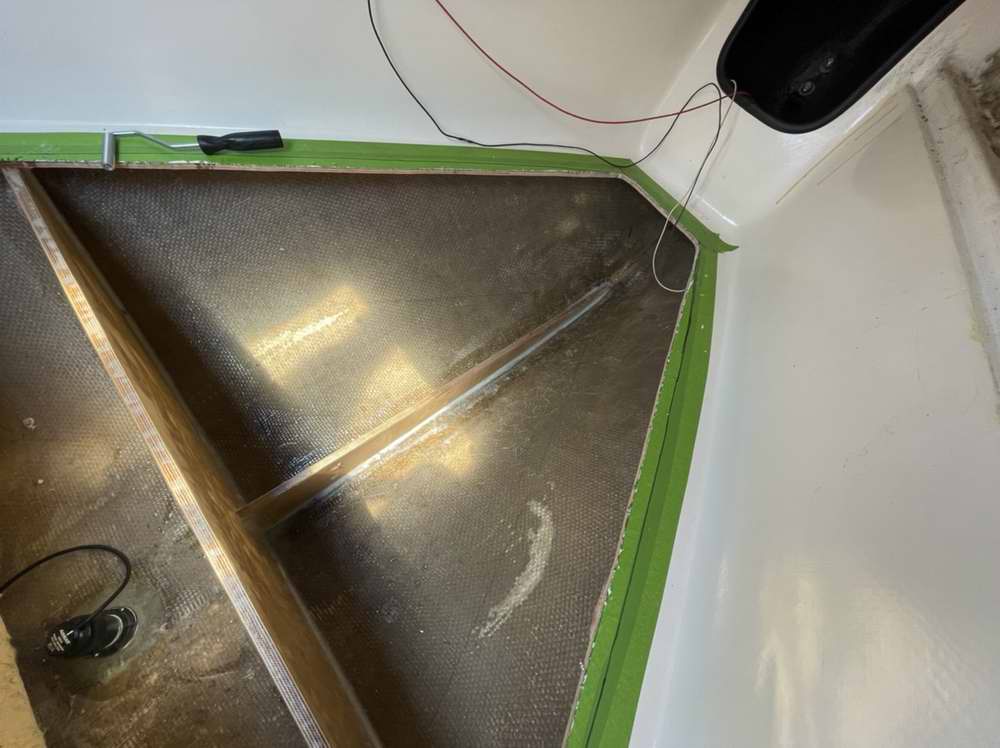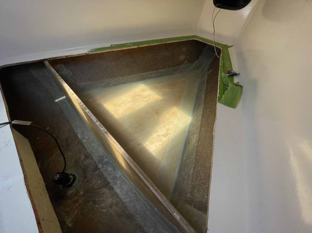 I started by cutting out the V-berth pan with a jigsaw. The pan is curved on the sides but I cut straight sides to make it easier to refinish this area after the electrical components go in. Then I scribed and epoxied in a new transverse bulkhead that would improve the lateral stiffness of the hull as well as give me an aft end of my electrical “bath tub”. I used West 105 Resin with 107 slow hardener and colloidal silica to thicken. At long last! I scribed a new floor out of 1/2” Baltic birch plywood and it’s starting to look GREAT. Exactly what I was hoping for. You can also see the thru-hull for the depth & speed meter. Then I cut a new stem/centerline rib that would sit under the new false floor. The reason was to stiffen the “drum head” nature of the factory-unsupported bow of the boat. I bonded and filleted it in the same way as the transverse bulkhead. You can see some bubbles on the top of the transverse bulkhead where the glass didn’t fully sit down on the wood but that doesn’t matter. That edge will be fully covered by a hardwood trim strip as part of my V-berth renovation and it’s not structural. I’ve since sanded the top of that bulkhead anyways. The false floor was properly tabbed to the bulkhead and the rib to the hull. I used 6” wide glass mat and West resin. While I was at it I added a few more layers in the nose. I used a silicone spatula to fillet all the edges nicely. I used my new battery as weight to ensure the floor was sitting fully on the rib below it. Mid-project tools kept piling up… Believe it or not I actually raced the boat with this pile in the V-berth “Anything worth doing is worth overdoing”, so I painted the new compartment with three coats of Bilgekote. On the way to Olympia, WA for the haul out prior to do this job, the sound of the waves resonated inside the boat because of the large surface area of unsupported hull in the bow. After finishing I can say that the boat is dead silent. It sounds like a sledgehammer hitting waves. Almost no noise and very stout feeling. Hard to describe, but I’m sure your can imagine. No lingering “wobbles” or vibrations after going over a big wave, it’s rock solid. I could NOT be happier with my decision to do this project. |