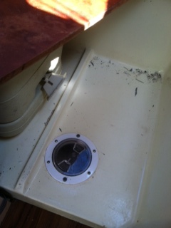 The previous owner added the folding steps for boarding from a dinghy. The line is a means of boarding more easily from an accidental overboard. A cool idea to use an access plate to remove water below