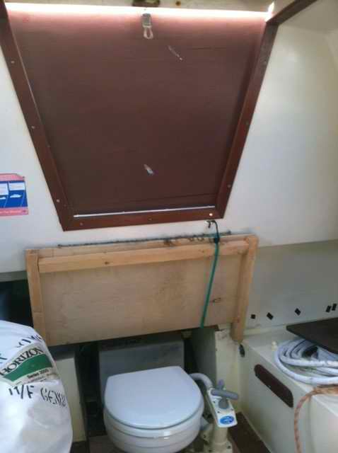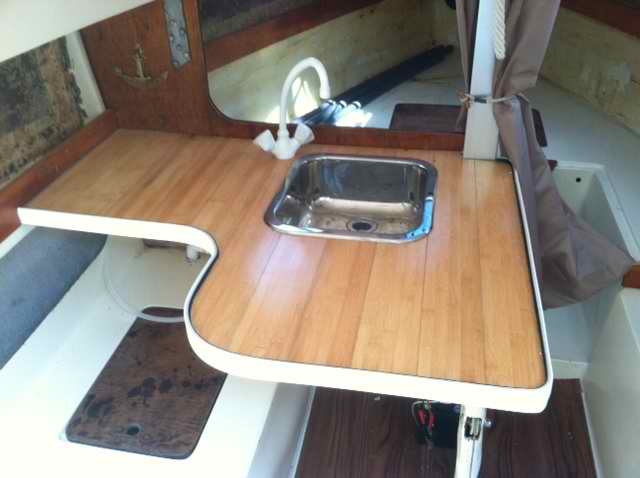 Relocate the galley. That is bamboo flooring installed on a 1/2" plywood table top. The water comes from a tank under the port settee. Not sure where the sink drains to. I never did find this out.