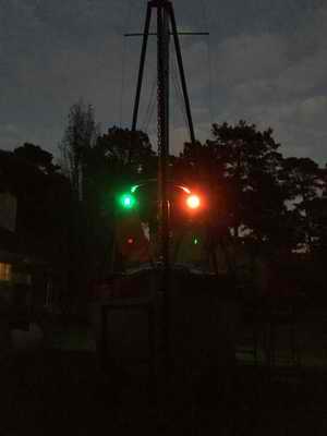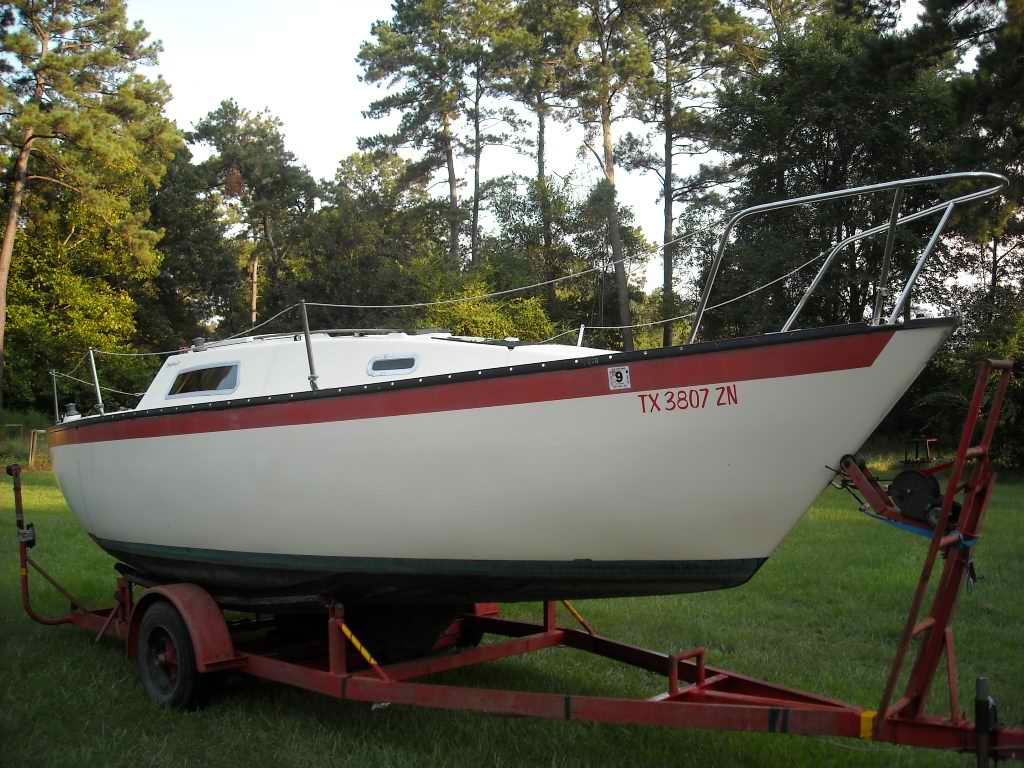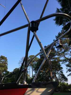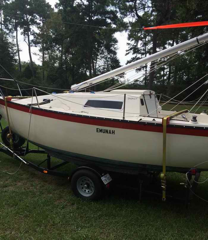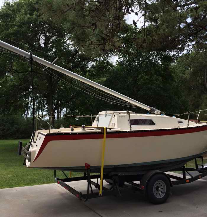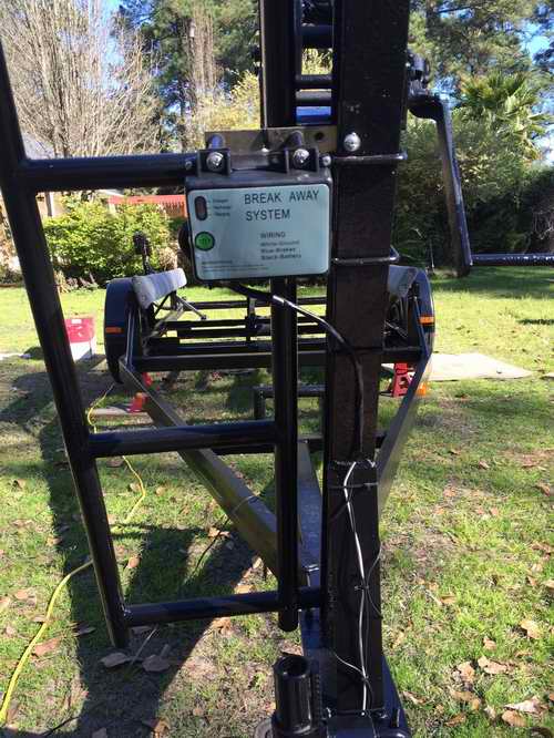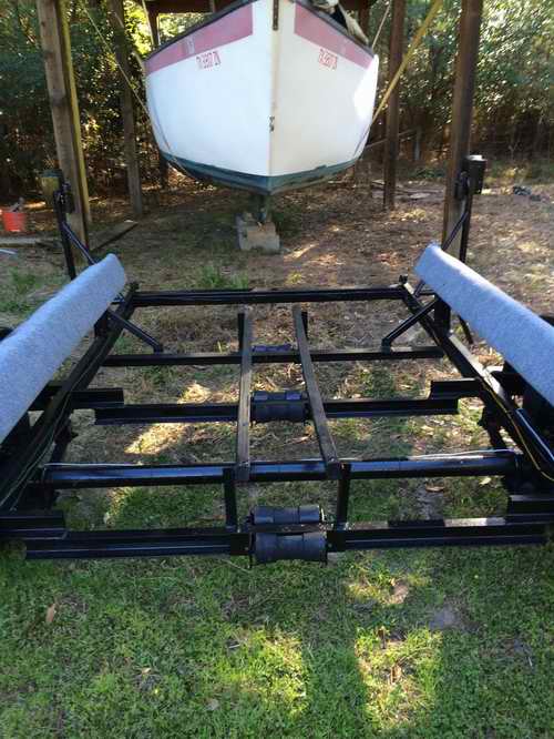 The mast stepping hardware consists of a guyed pole mounted at the front of the trailer. The pole is guyed at the front for stiffness and angle braced to the toe rails to prevent sideways movement. It uses the huge mechanical advantage of the trailer winch to raise/lower the mast via the sheave at the top. Since he must stand at the trailer winch to operate the system he has also incorporated two temporary shrouds equipped with springs to keep the mast centered over the hull. The two lines tied at the cockpit tracks are to pull the mast aft for lowering it. An initial pull is required to overcome the lift motion due to the mast step. It is not evident in this photo but the free ends of the lines are lead forward where Randy can tug on them to pull the mast aft.