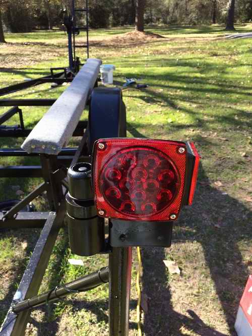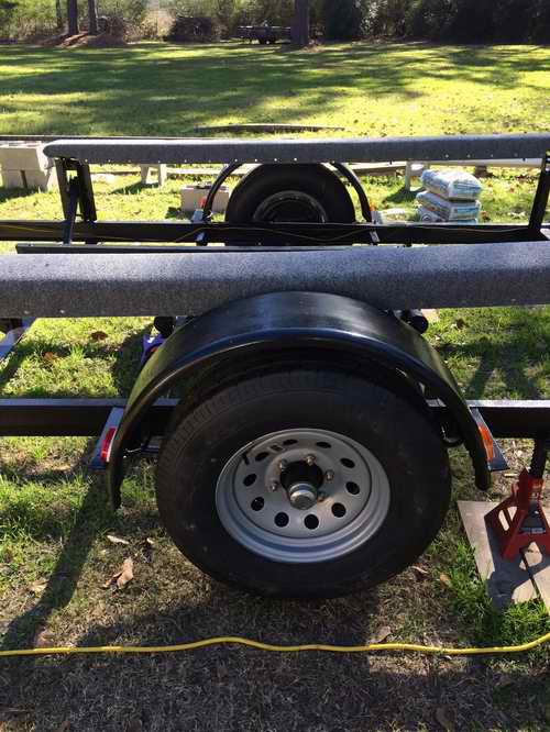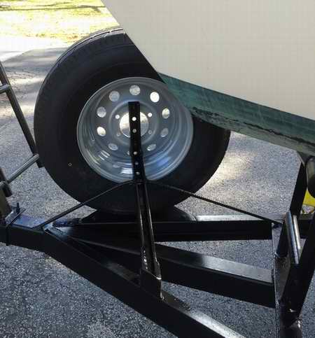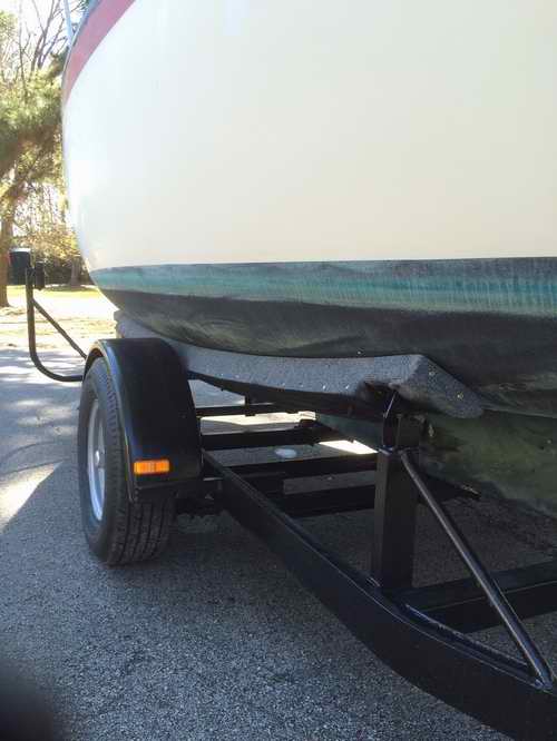 With the trailer free of the boat it was easy to paint the metal, replace the bunk boards, install new rims with tires, add a break away switch and install maintenance free LED lights. The original bunk boards were no longer up to the task and were replaced with stronger ones consisting of two laminated (2x6)"s. They were bent to conform to the hull shape by hanging a weight in the middle, then glued and screwed to each other while in their bent shape. They were left to hang with the weight till the glue fully cured. Then it was time to add the rug, leaving the bottom of the bunk board exposed to ventilate water, thereby preventing wood rot. A last thought was to add some secure tie down straps. These are well documented in Tech Tip A01. The hull was lowered on the trailer and pushed back to the protection of the pole shed for further assessment. While it was there it was easy to fit a roller under the bow and add mounting hardware for the spare tire. TRAILER SPECS - Welded steel frame, single axle rated at 5000 lbs.