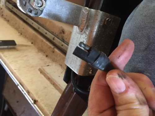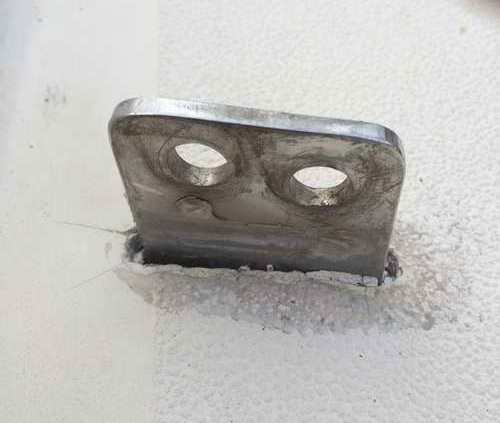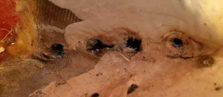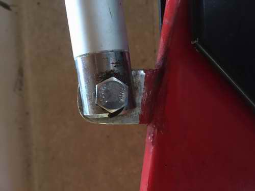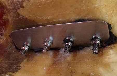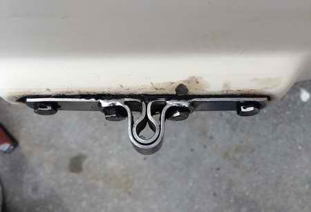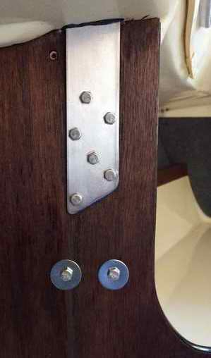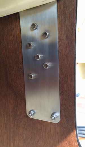 The previous owner used the rudder to "feel" the bottom and bent the lower gudgeon in the process. This tore out fibreglass which naturally caused a leak beside the bolts. So after repairing the damaged fibreglass with epoxy Randy strengthened the installation with a single stainless backing plate behind all four nuts. This guy really believes in making is tough to break! Longer bolts were required for the extra thickness and the holes were sealed with lots of butyl rubber. Much of it oozed out as the bolts were tightened, ensuring a water tight seal.