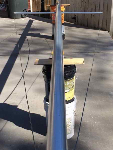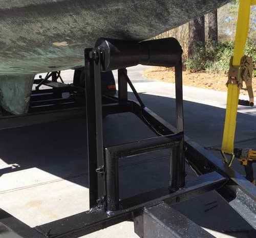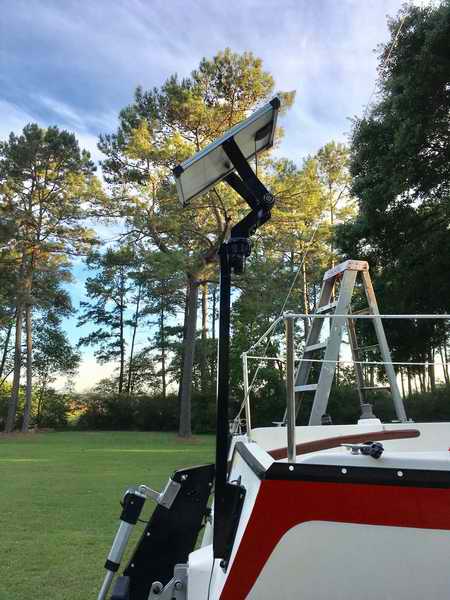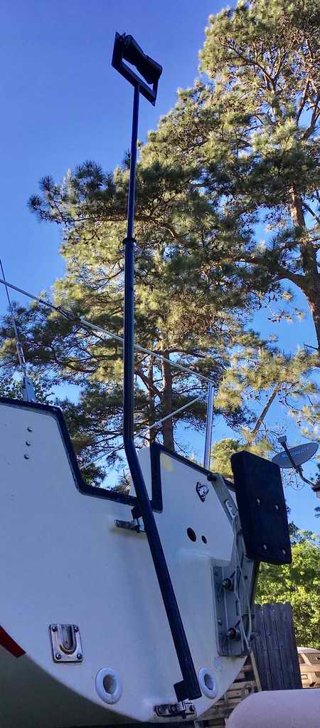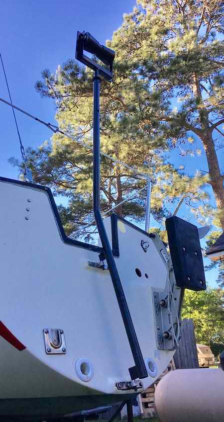 STEP MAST - Below is Randy's version of a transom support post to transport the mast. He went one step further by making it telescopic. Shortened is for road transport and extended is to lift the mast the initial 300 to assist in stepping it. Without this initial lift it is next to impossible to pull the mast up off the deck even with a block and tackle from the bow. Lateral support will be two lines tied from the roller at the top to the cockpit cleats using a cam cleat to allow for extension of the post. This telescopic feature makes it possible for one person to step the mast.