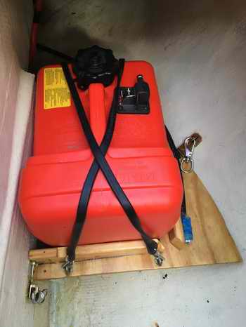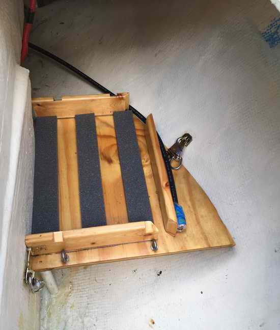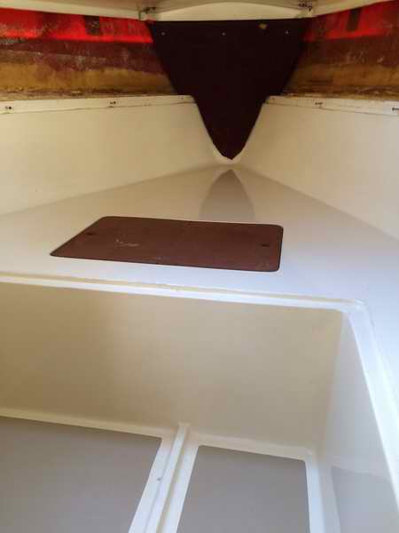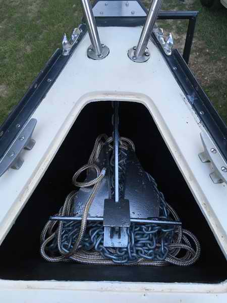 ________________________________ Next it was time to tackle the leaking locker lids. This is described in Tech Tip B15. Anchor Locker - The locker holds 200' of 1/2" line with 25' of 5/16" chain and has room to spare. The line is secured to the bulkhead and the lid is held down with a bungee cord.