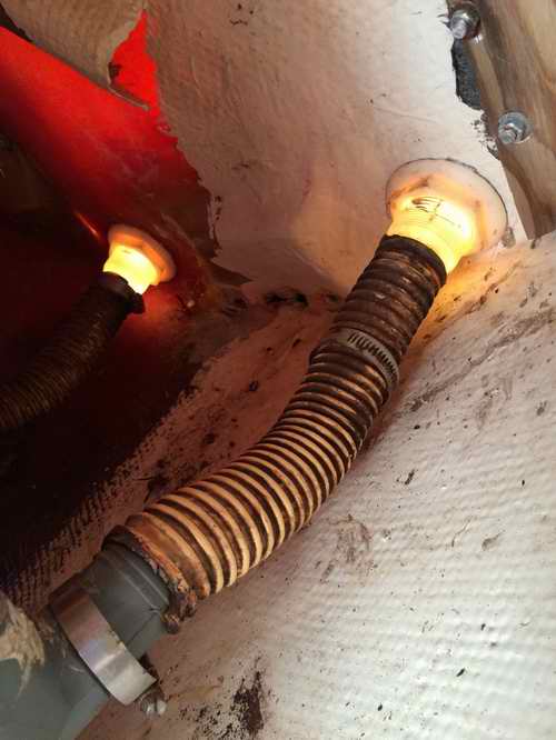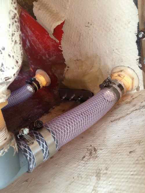 So while he was under the cockpit (probably the least fun place to work) it was time to replace the aging cockpit drain hoses. As you can see the old hoses were not rated for marine use. They were also not fully slipped over the barbed fittings and were secured with only one clamp. Because these hoses are so flimsy they should never have been installed and they should have had two clamps. The new fiber reinforced hoses are installed correctly with the clamp screws on top so they have a fighting chance to stay corrosion free and can be adjusted later in life. Water test -> ....... no, nada, zero, zilch leaks! Tech Tip B17.