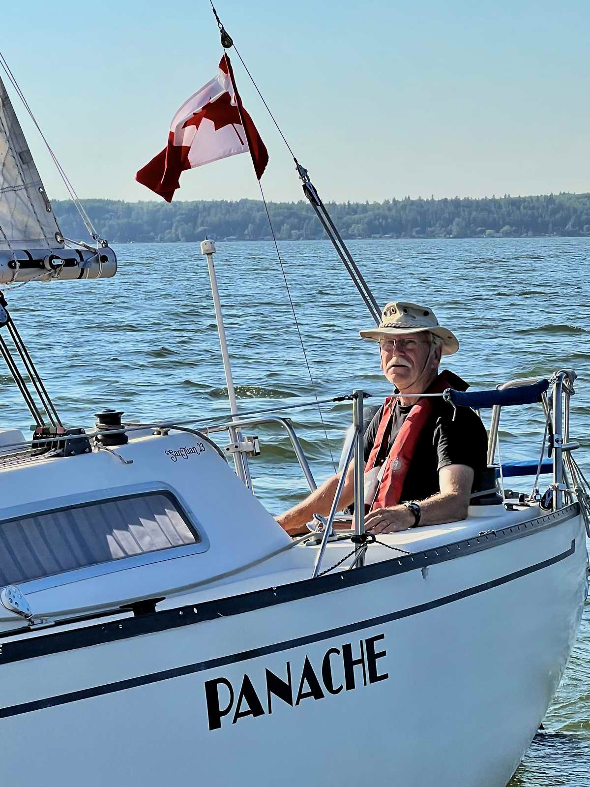 Dave was busy talking up a storm with the guys when I surprised them by sneaking up on their lee rail. I finally caught up after retrieving my dinner out of the sink. Things tend to roll around in the cabin when a gust knocks you about.
