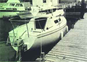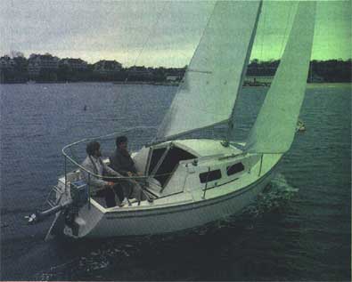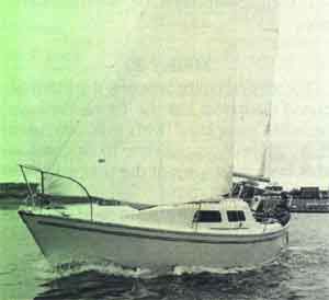 The San Juan is responsive to its helm and sail controls, and beginning sailors will learn their lessons quickly. With its racing heritage, the 23 begs for just a few go-fasts, perhaps a spinnaker or genoa or two. Good deck space and slotted toe rails should make adding the necessary hardware fairly easy. San Juan combines chop and roving in amounts sufficient to produce a stiff hull. Balsa core adds additional stiffness to the deck lay-up without a weight penalty. Exterior molded surfaces are smooth, fair, and uniform in finish and color. Some interior panels showed minor fabric print-through, but not enough to be objectionable. The 23 carries its 900 pounds of lead ballast in a fiberglass stub-keel. The 65-pound galvanized steel centerboard is easily handled by block-and- tackle in the cabin. NOTE: The above comments are reflective of the later version MKI SJ23. The windows shown above are not standard. The standard windows are permanently closed. Bob Schimmel.