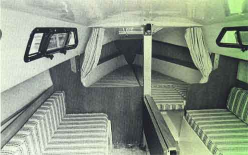 REVIEW: The San Juan 23 is a cruising design derived from Bruce Kirby’s successful racer, the San Juan 24. While the San Juan’s modified “blister” house that looks so sleek on larger racers loses some of its style when placed on a short, high-sided hull, it does provide plenty of room below. A simple, open layout is enlarged visually with the use of partial bulkheads as shown above. For a 23 footer, the teak-trimmed galley is large and easily worked, but its athwart ship location beneath the companionway means you must be careful lest the crew step on your supper. A folding table mounted on the centerboard trunk adds a nice, functional touch. The berths (aft) extend well into the main cabin. No coffin quarter berths here. The settee backs are too far outboard (or the house sides too far inboard) for a sailor of normal height to sit against without slouching or hitting their head. This is a common problem aboard most of the boats we sailed. Only the Tanzer and Merit avoid it with their raised-deck construction. As in the Sirius, this San Juan cabin sole is carpeted.